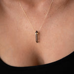 A necklace featuring a hand-cut smoky quartz crystal point with a 14k gold band and a 2.5 mm diamond, attached to a 20-inch diamond-cut chain.