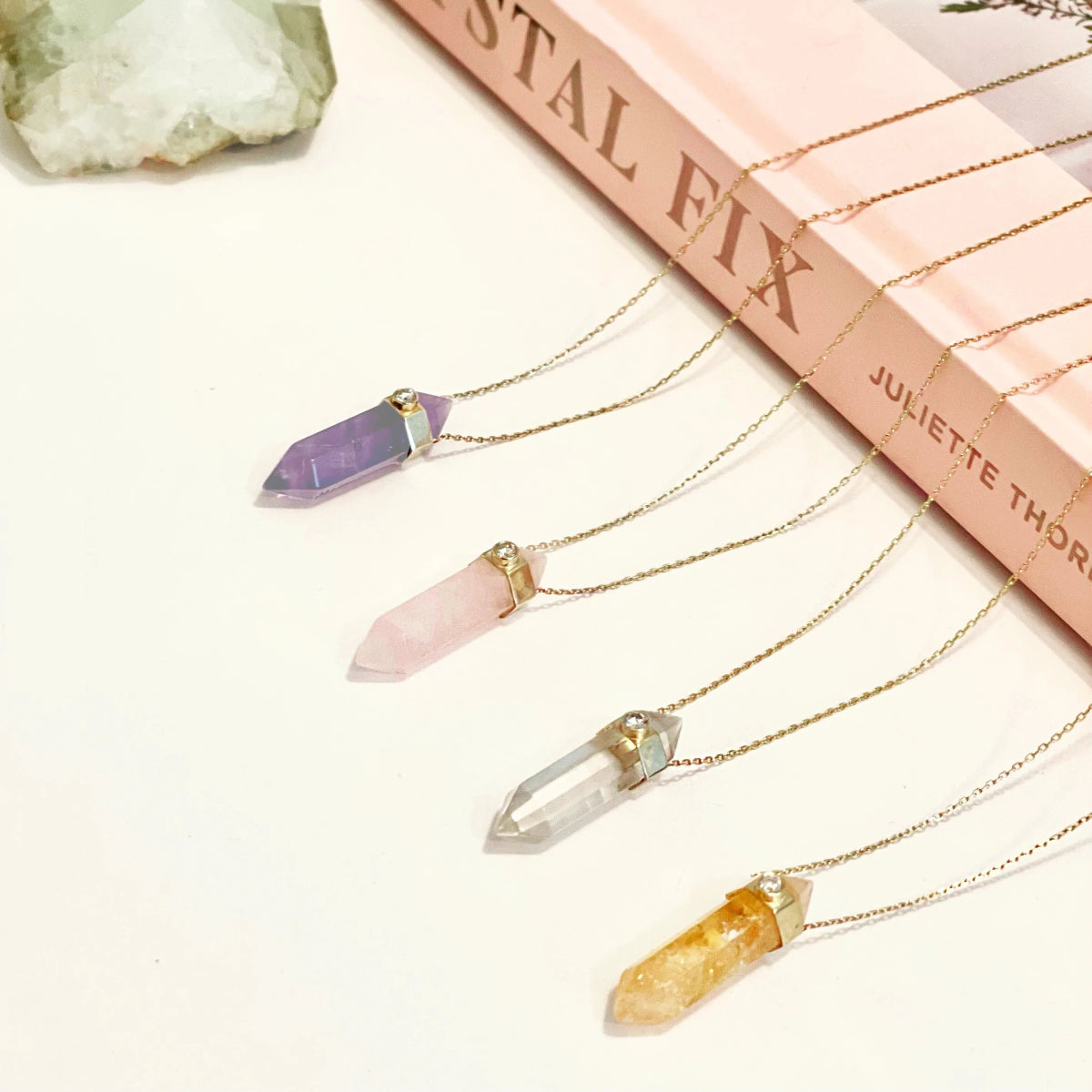 The hand-cut crystal point is wrapped in a 14k gold band with 2.5 mm diamond. The 20" diamond-cut chain has an additional jump ring at 18" for alternate length options.
