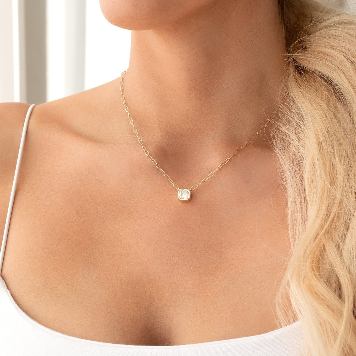 Meet the C’est Moi Deco Necklace – your new go-to accessory for a touch of everyday glam! Crafted in Maya Brenner’s classic yet whimsical style, this necklace showcases a 7x7mm asscher cut moissanite stone nestled in a bezel set pendant, complemented by a 1.95mm elongated link chain. Available in 14k yellow, rose and white gold. Wear it solo or layer it with our Element Short Link Chain for a more trendy look.