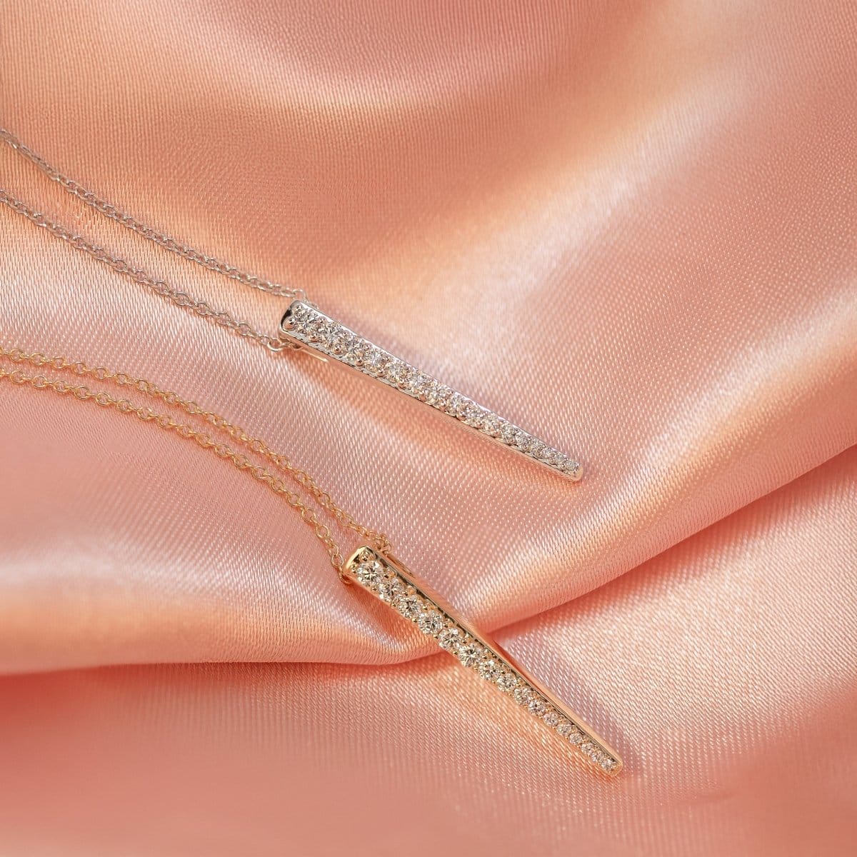 Our Love Struck Diamond Necklace is a Valentine’s Day exclusive, designed to dazzle long after the roses fade. This limited-edition necklace features a sleek, tapered bar pendant adorned with graduated pavé diamonds, adding a touch of timeless sophistication to every look. With 1/4 carat of natural diamonds and an adjustable cable chain (16", 17", or 18") it’s the perfect blend of edgy elegance made to keep hearts racing.