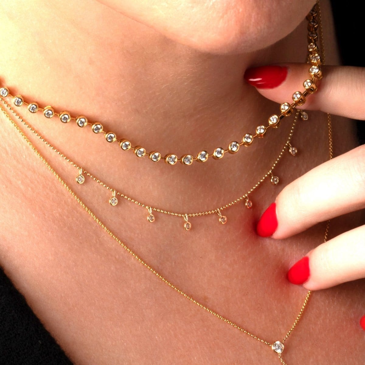 But there's more – a feature that sets the Ultimate Diamond Tennis Necklace apart. Thanks to Maya's innovative design, this necklace stays perfectly in place, showcasing its diamonds without interruption. It literally does not flip! Experience the luxury of knowing that your necklace will remain flawlessly aligned at all times.