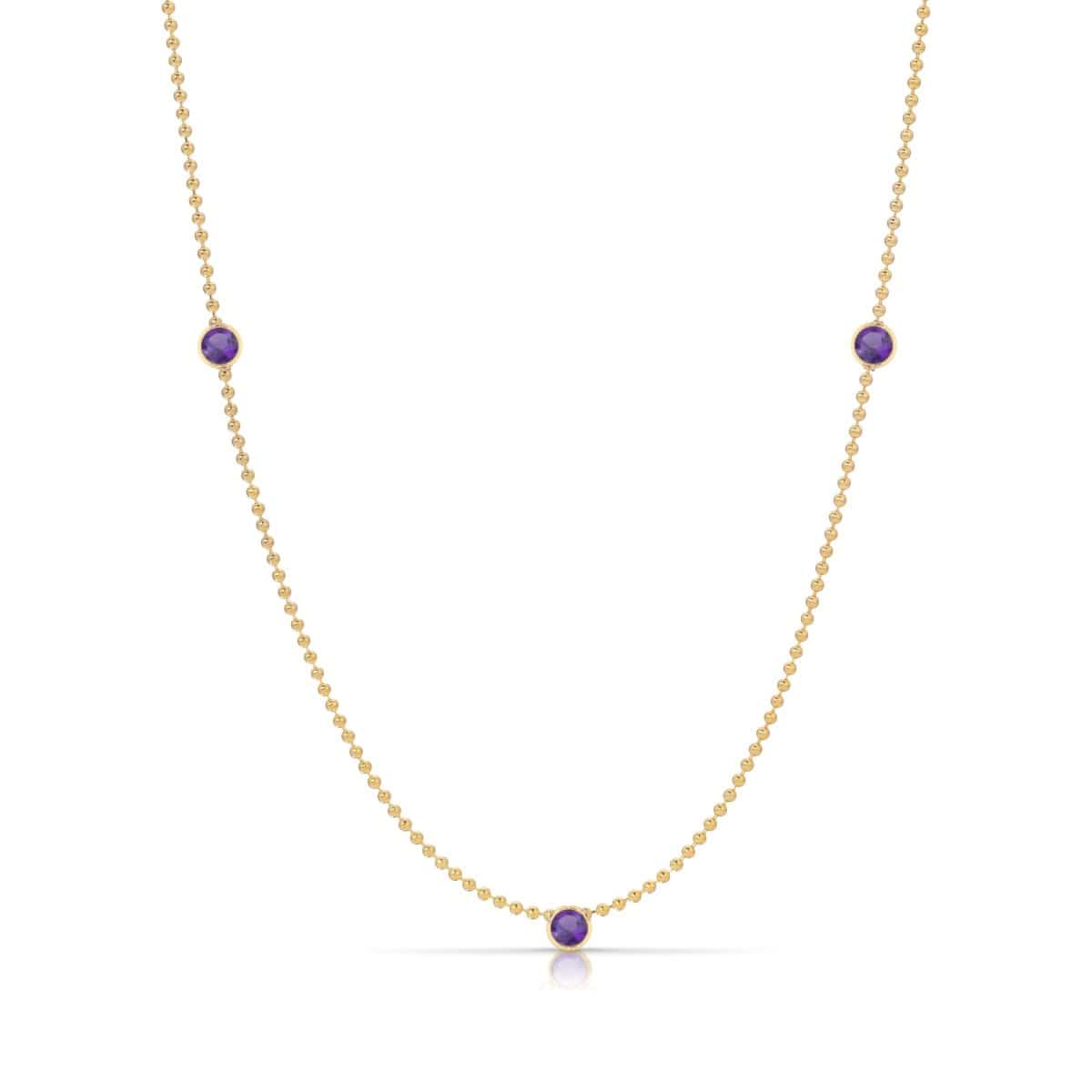 A Triple Birthstone Layering Necklace - Yellow Gold in Amethyst - February on a white background.