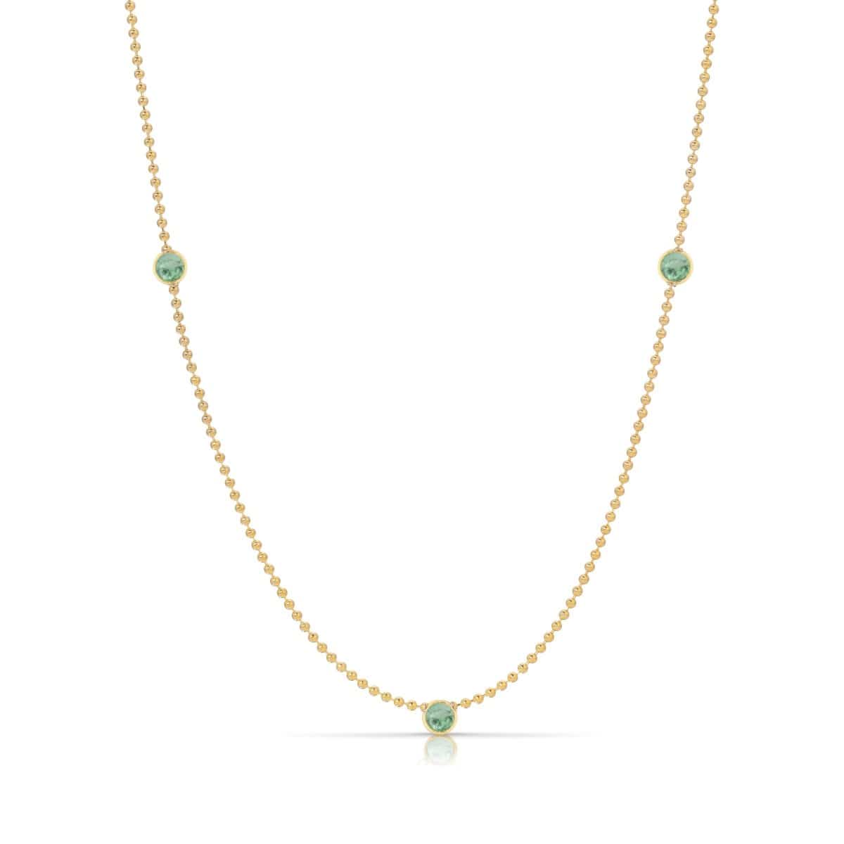 A Triple Birthstone Layering Necklace - Yellow Gold in Emerald - May on a white background.