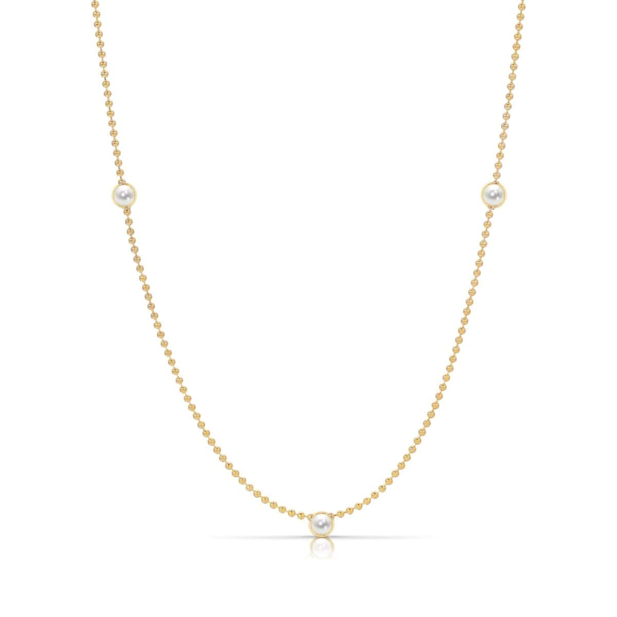 A Triple Birthstone Layering Necklace - Yellow Gold in Pearl - June on a white background.