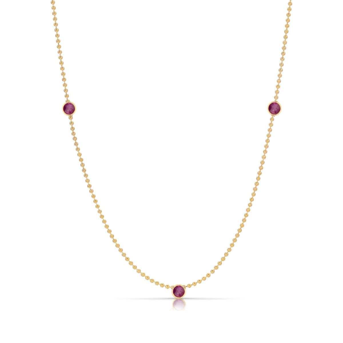 A Triple Birthstone Layering Necklace - Yellow Gold in Ruby - July on a white background.