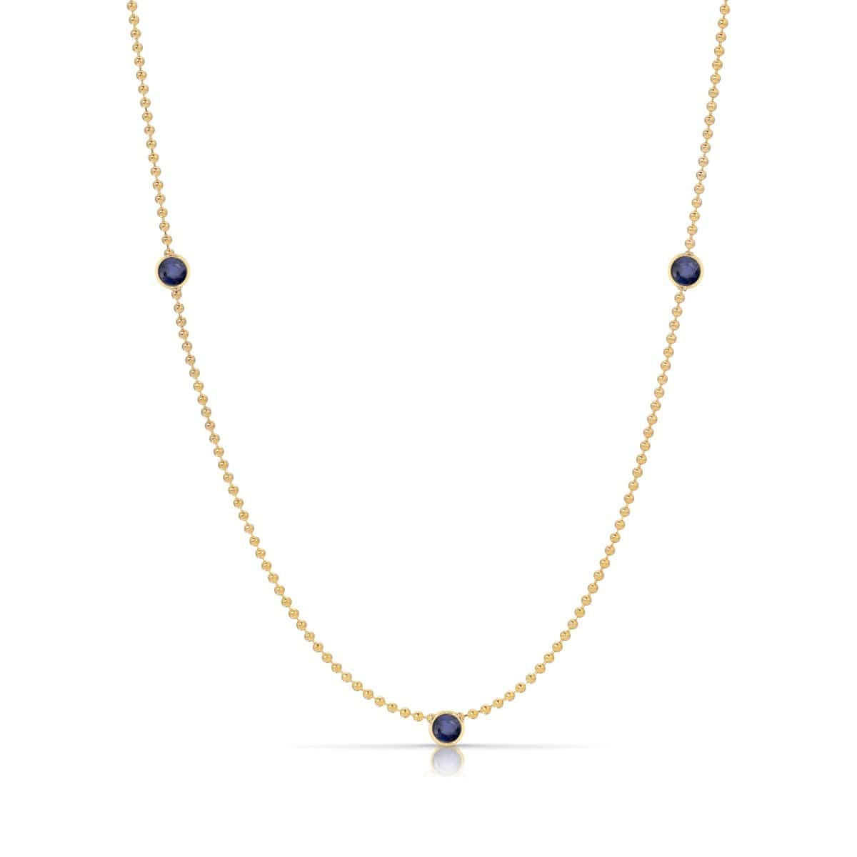 A Triple Birthstone Layering Necklace - Yellow Gold in Sapphire - September on a white background.
