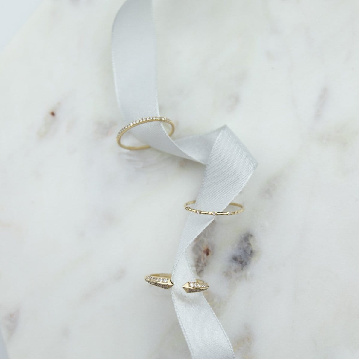 14k yellow gold textured delicate band with 4 white diamonds. 1 mm GHSI2 White Diamond total weight .99 grams