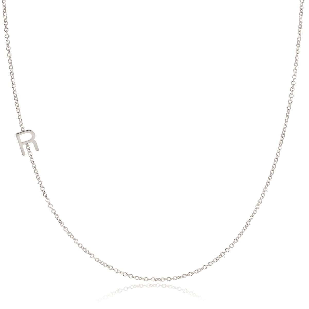 Close-up of a woman's neck wearing a white gold necklace with a letter R charm.