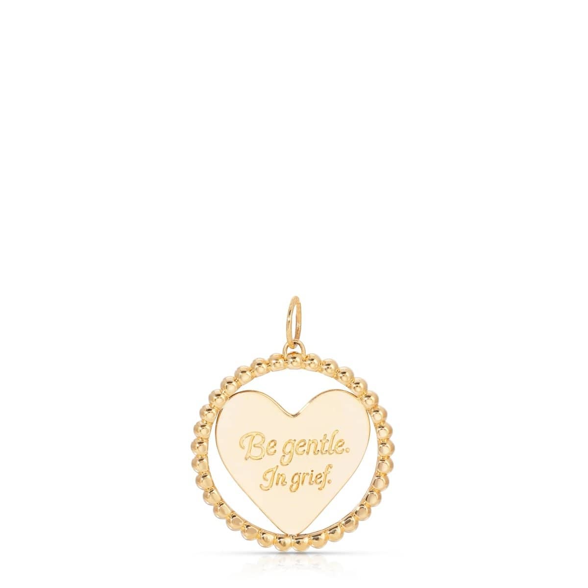The fragility of the heart etched with “Be gentle. In grief.” on one side and the other side etched with your special person. Surrounded by small beads that represent the community that surrounds and protects my heart. I hope this allows you the gentle space your heart needs and to always remember your special person.