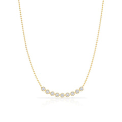 A close-up of a woman’s neck wearing four yellow gold necklaces: two Custom Gold Necklaces (one with three charms and the other with four charms), the Clarity Retreat Necklace and the Diamond Arc Layering Necklace, with a cream top.