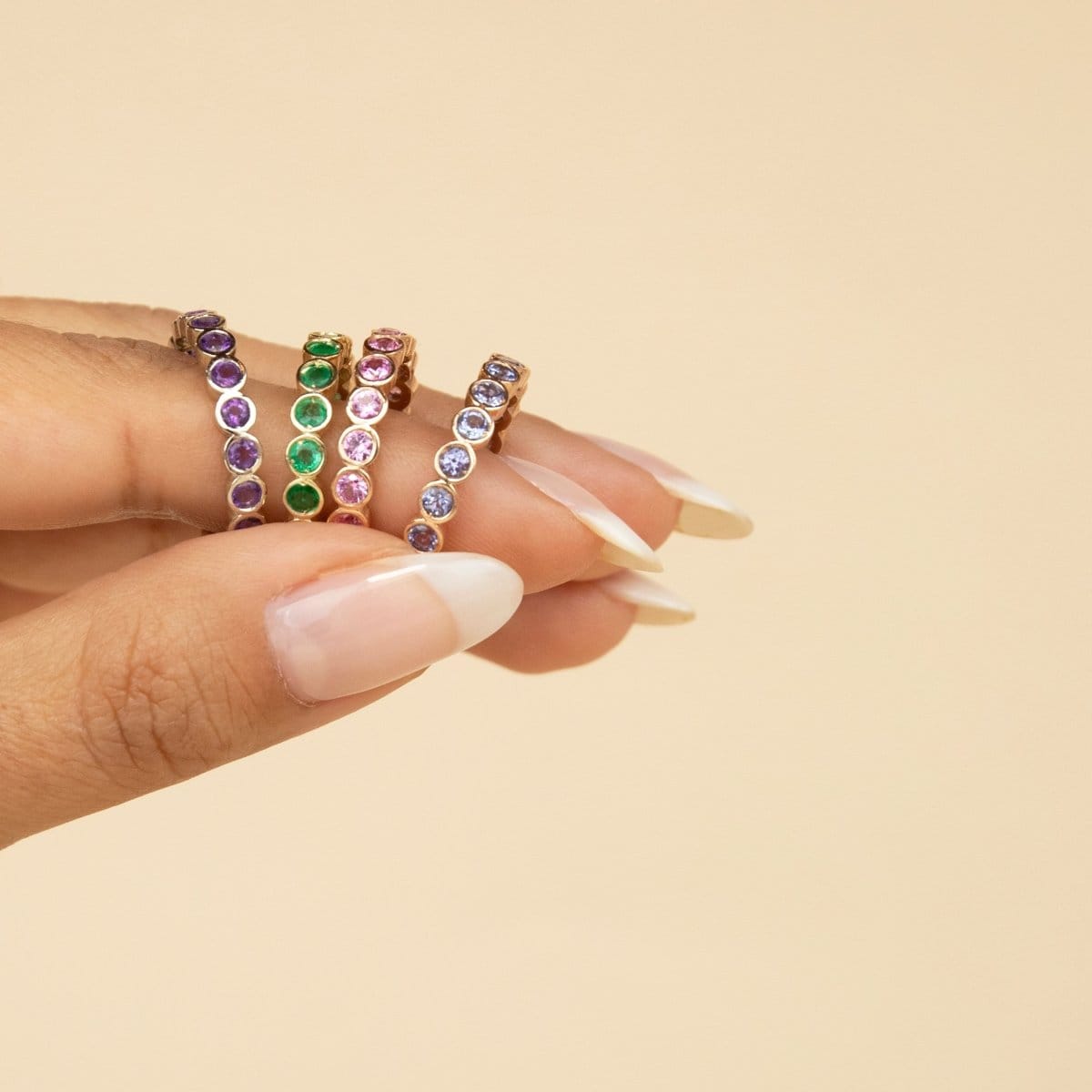 A hand holding The Violet Bouquet Ring, The Fern Bouquet Ring, The Peony Bouquet Ring and The Periwinkle Ring against a light neutral background.