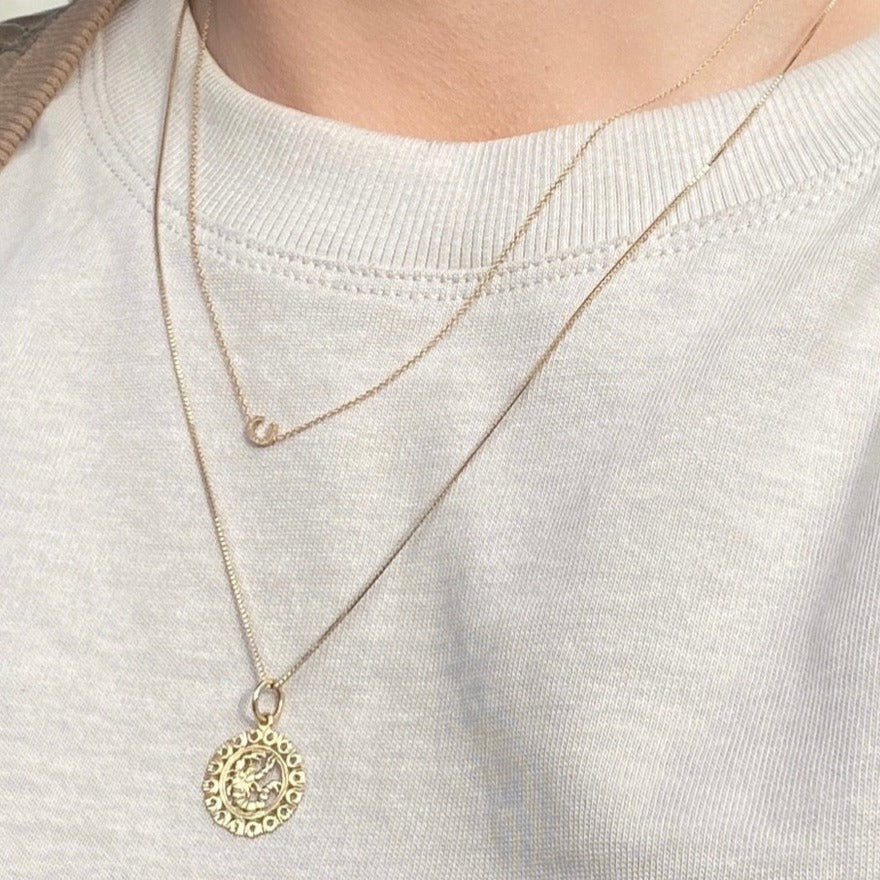 To celebrate our 20th year in business we've decided to reintroduce a Maya Brenner classic. These intricate Zodiac Pendants are 14k yellow gold and measure 7/8". They are strung on our Adjustable Layering Chain, a 14k yellow gold box chain that can be adjusted from choker length to 22".