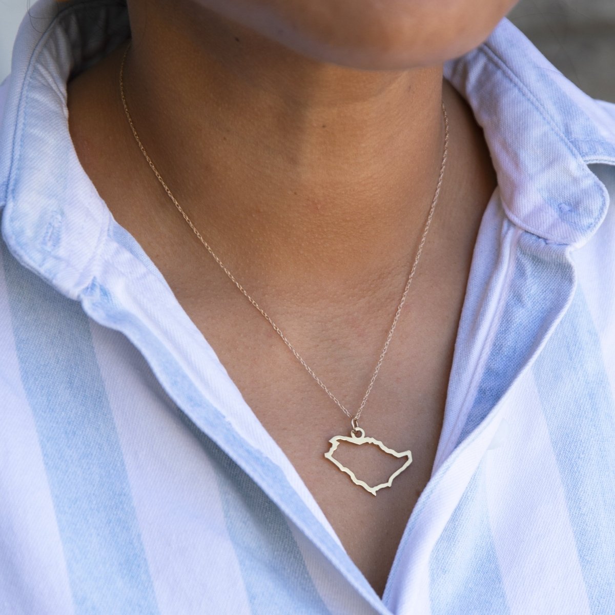 A Saudi Arabia pendant necklace in yellow gold on a white background.