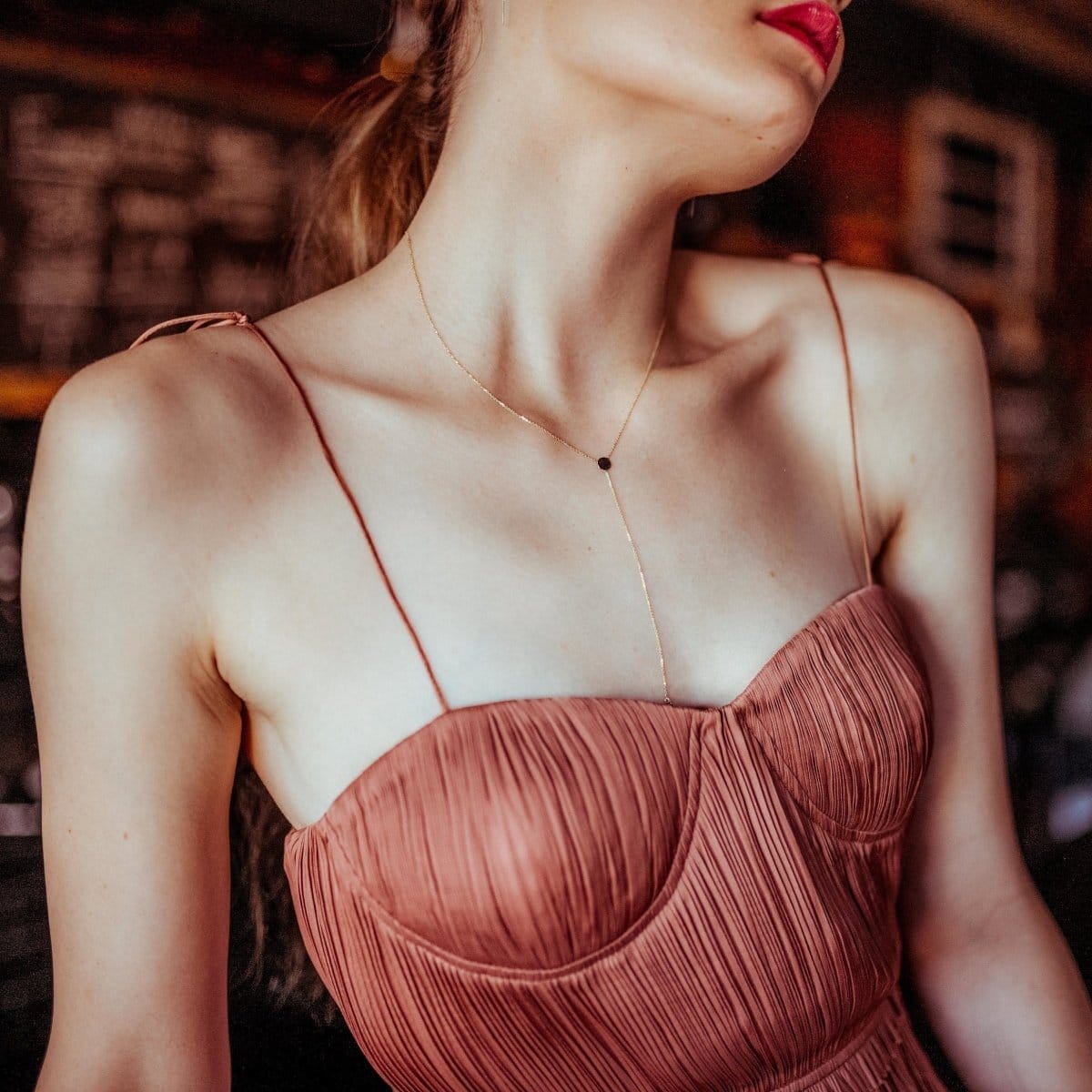 The peek a boo chain hangs low for just the right amount of flirty feel. Wear with a low cut top or over a white tee.