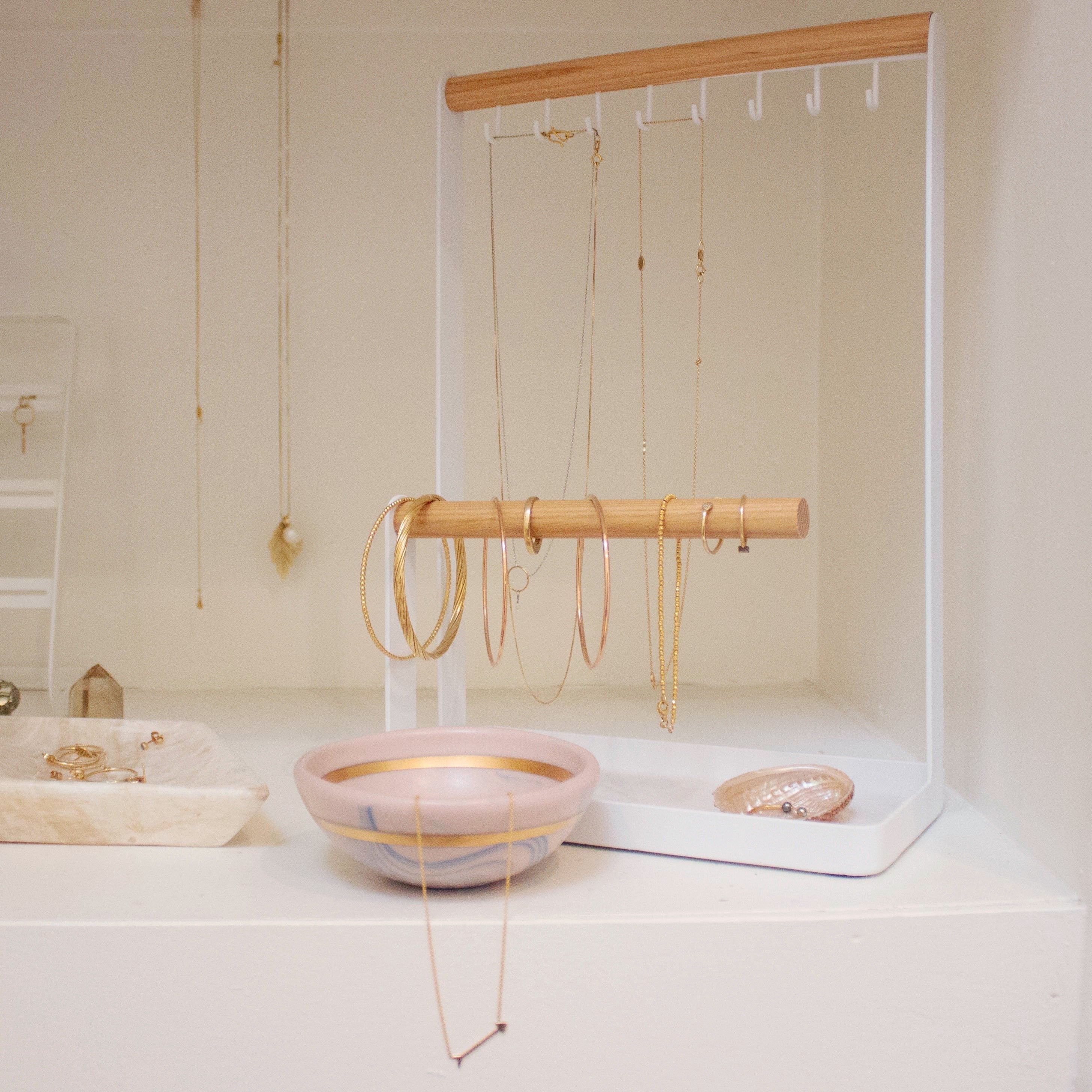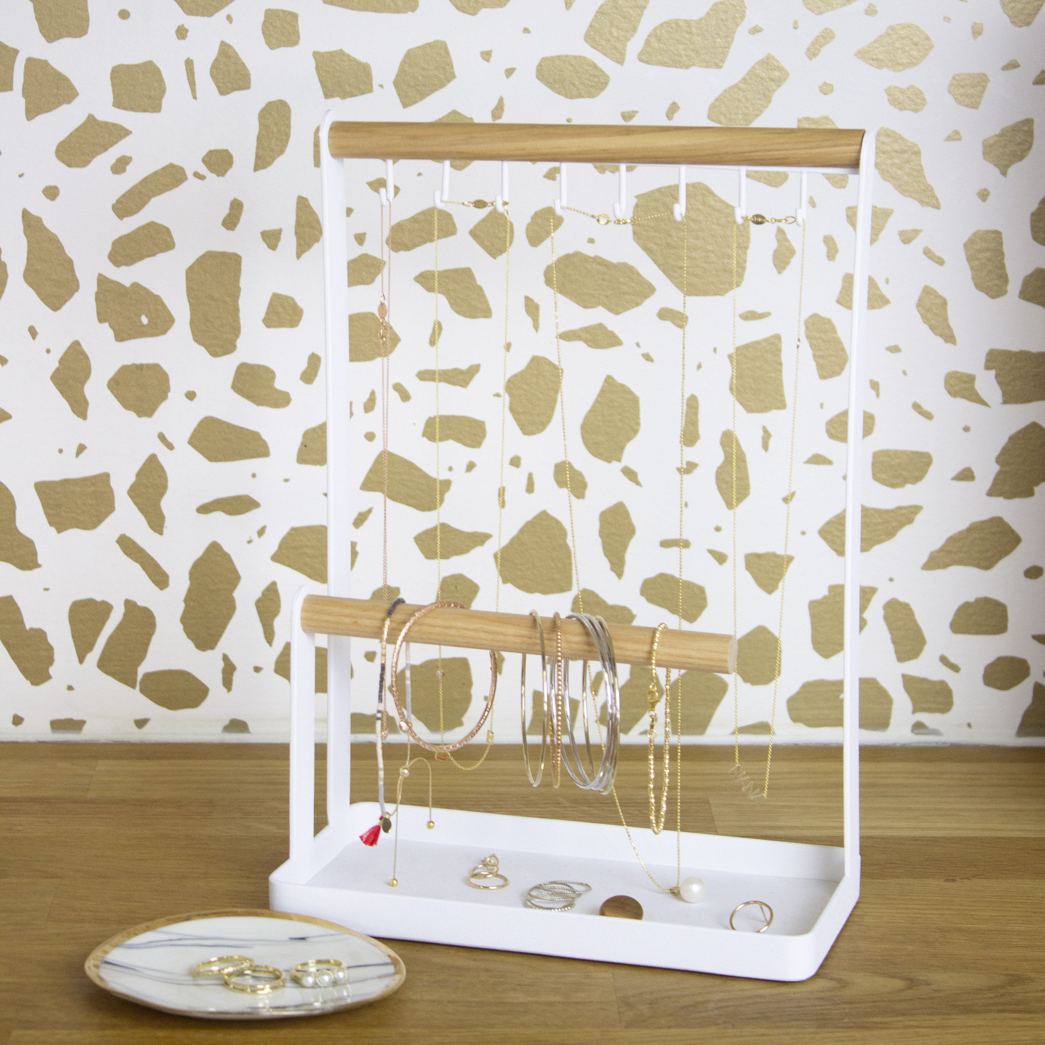 Stylish, sleek and functional, this jewelry stand has lots of storage for necklaces, bracelets and everything else.