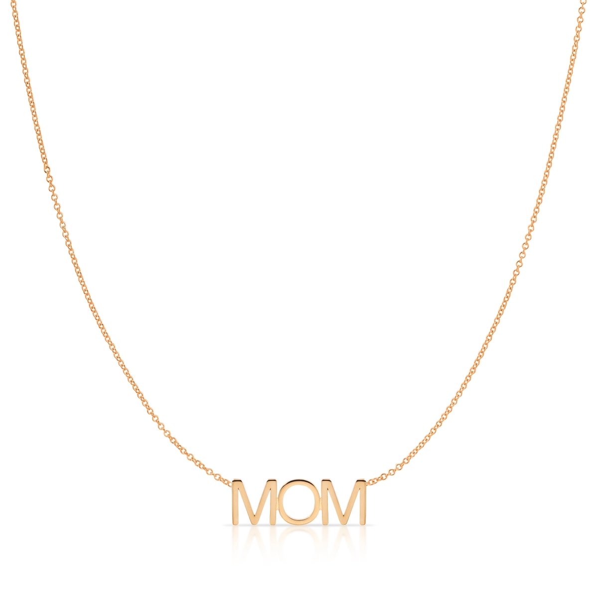 A MOM Necklace in rose gold with a cable chain on a white background.