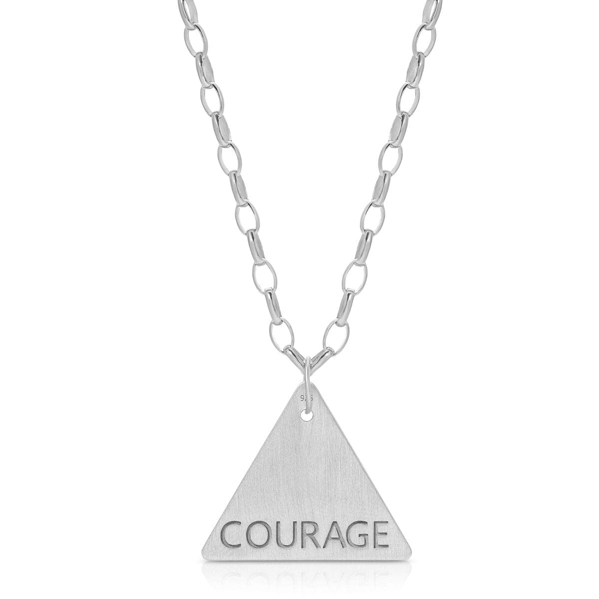 The back of a Virtues Pendant - Triangle in sterling silver with ‘COURAGE' engraved on a white background.