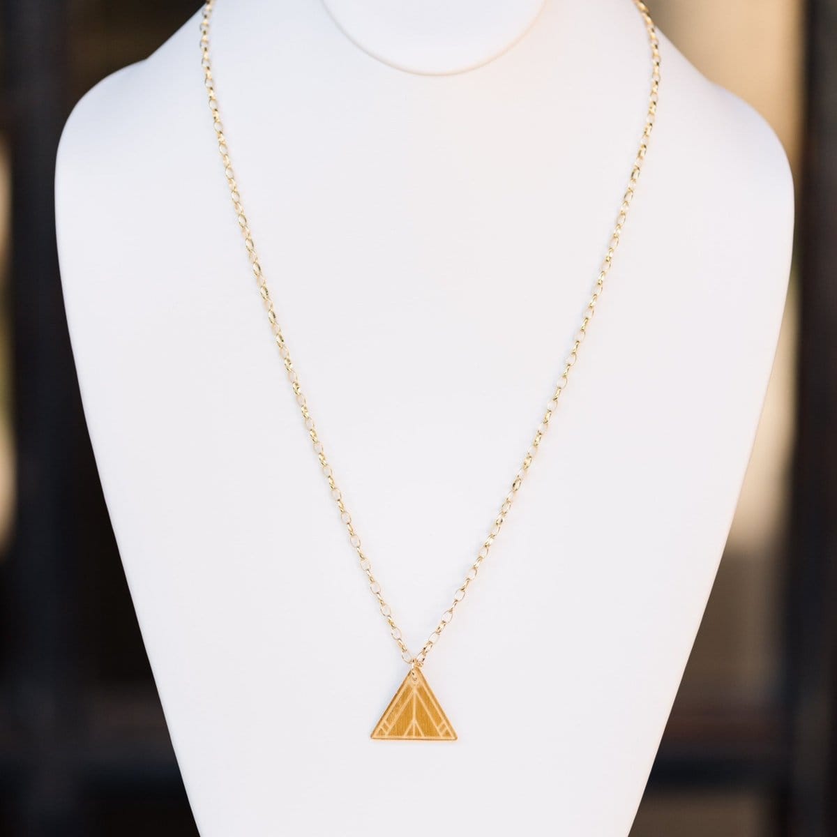 A Virtues Pendant - Triangle in yellow gold on a white necklace stand.
